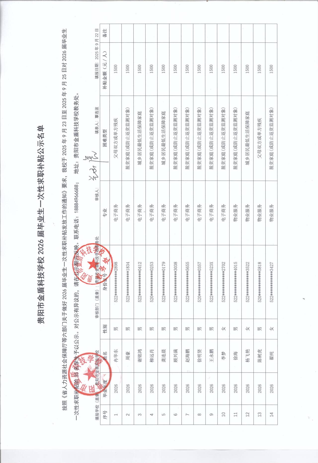 贵阳市金盾科技学校2025届毕业生一次性求职补贴公示名单